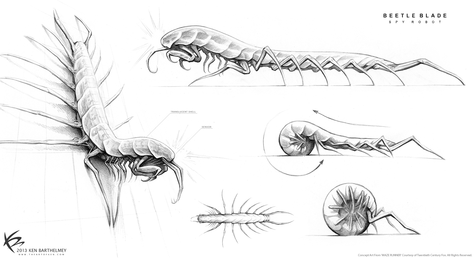 The Beetle Blades didn't end up in the film, but I had a blast working on them. There were a few fun scenes in the script. Wes described them as the 'observation cameras' from the maze, therefore I attempted to make the design very functional. At the very beginning we thought about making them bio-mechanical, similar to the Grievers. Wes wanted something like a mutated and scary looking sowbug.
